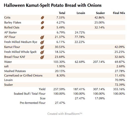 I wanted to bake a nice soft and flavorful bread but one with some healthy grains as well. In went a soaker left for 24 hours in hot water comprised of grits, rolled oats and barley flakes. I also added some left-over mashed potatoes and some grilled onions.