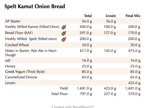 I wanted to use a beer in this bake and decided that fresh spelt and Kamut would go great with the Pale Ale I had in stock. Of course some caramelized onions would also go well with this combination and some Greek Yogurt and honey rounded out the flavor profile.