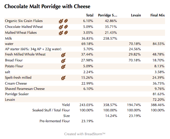 I had some Chocolate Coffee flavored Malted Wheat left-over from a rye bake from last year and it was just crying out to be used in a porridge style bread. Throw in some cream cheese and shaved Parmesan cheese (not that grated powder stuff that tastes like saw dust) and mix with some freshly ground Spelt and Whole Wheat and a few other goodies and what’s not to like?