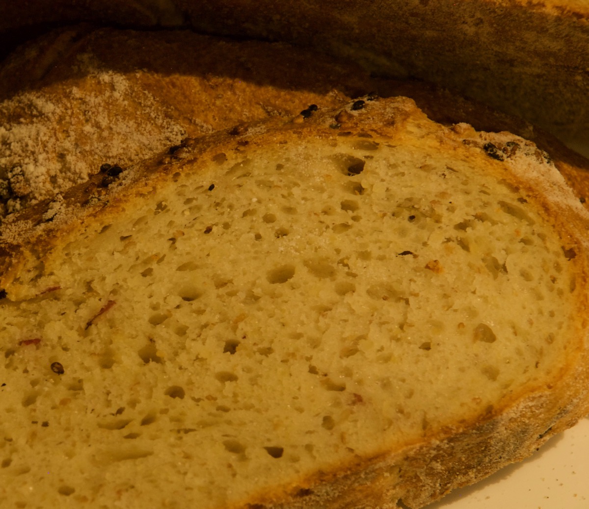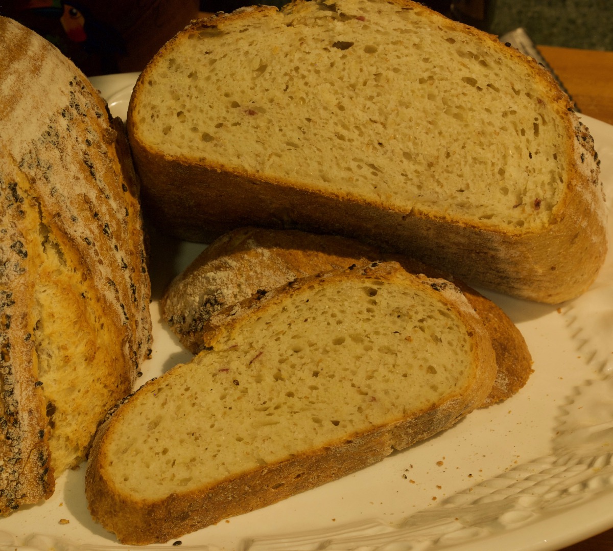 The addition to the smashed potatoes with the durum and Kamut flours resulted in a moist, flavorful bread with a moderately open crumb.  This one is perfect for grilled bread, panninis, and simply with some olive oil or butter.