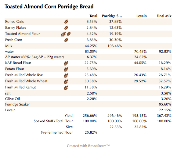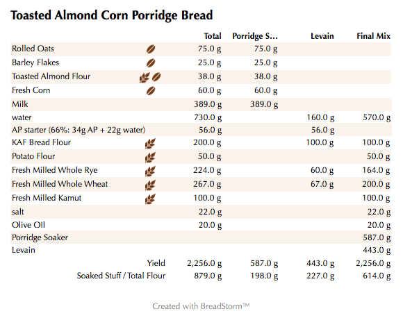For this bake I added some toasted almond flour and fresh corn to rolled oats and barley flakes for the porridge. I used a mixture of several whole grain flours which were all freshly milled.