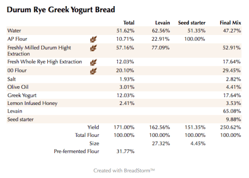 This is a pretty simple bake with mostly fresh milled and sifted flour with some Greek Yogurt added for some extra moisture and softness and a little lemon infused honey to round it out. I just bought a new #40 mesh sifter so I was able to get a pretty smooth durum flour close to what I used to buy at KAF.