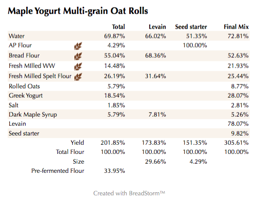 I wanted to see if I could get some maple flavor in these so I added a dark 100% maple syrup in the levain and in the main dough.  Well, that achieved nothing except making the levain triple in size from the natural sugars in the syrup.  It did add a nice sweetness to the rolls but not enough to be over the top.