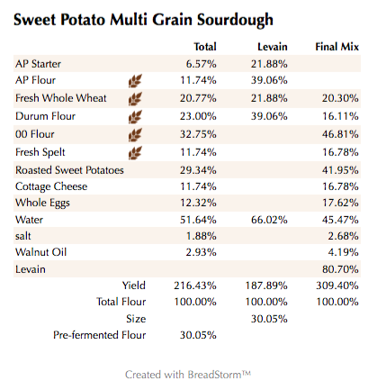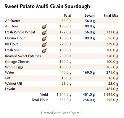 Note: Water content of whole eggs is 80 grams, Cottage Cheese 81 grams, Sweet Potatoes 145 grams for a total of 306 grams.  This was not included in the formula so the hydration of this bread is much higher than listed.