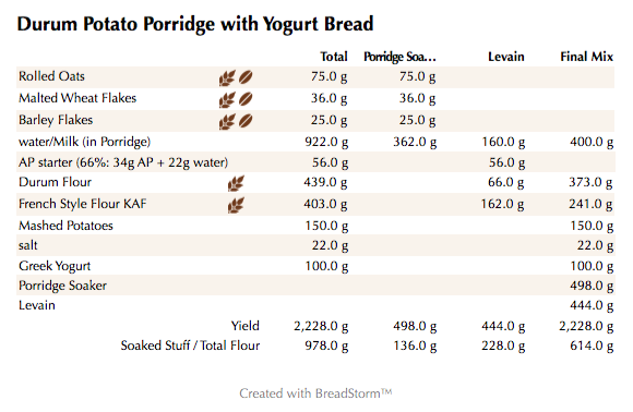 Mix the flours, potatoes, yogurt and the water (I used the water from cooking the potatoes), for about 1 minute. Let the rough dough sit for about 20 minutes to an hour. Next add the levain, cooled porridge, and salt and mix on low for 5 minutes. Remove the dough from your bowl and place it in a lightly oiled bowl or work surface and do several stretch and folds. Let it rest covered for 10-15 minutes and then do another stretch and fold. Let it rest another 10-15 minutes and do one additional stretch and fold. After a total of 2 hours place your covered bowl in the refrigerator and let it rest for 12 to 24 hours. (Since I used my proofer I only let the dough sit out for 1.5 hours before refrigerating).
