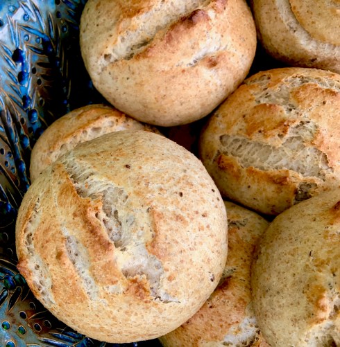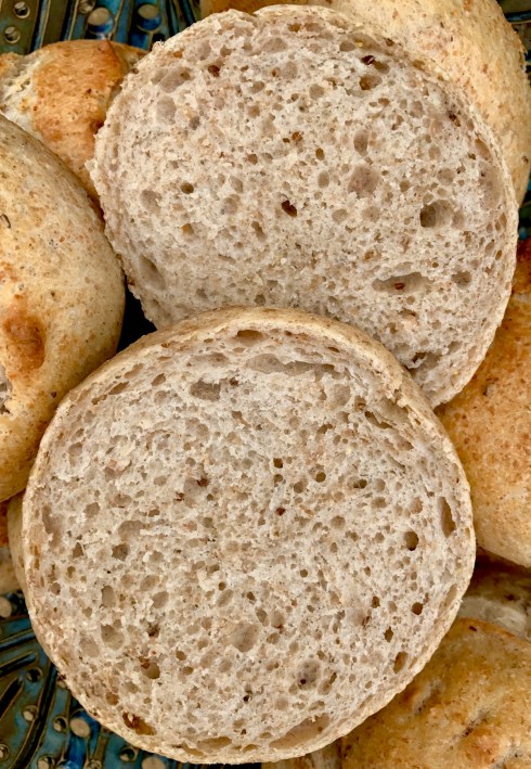 When you are ready to bake remove the bowl from the refrigerator and let it set out at room temperature still covered for 1 hour.  Remove the dough and shape into rolls around 125 -130 grams each.  Cover the rolls with a moist tea towel or plastic wrap Sprayed with cooking spray and let rise at room temperature for 1 1/2 – 2 hours.