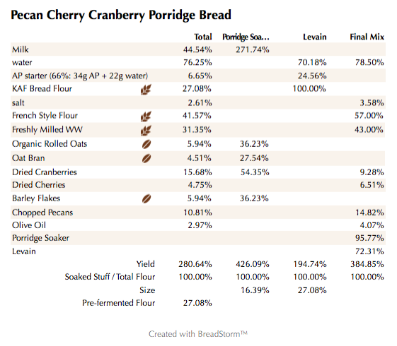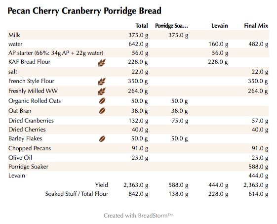 This is one of my favorite breads I’ve made to date.  I love porridge breads and the combination of pecans, cherries and cranberries really just made this one hard to resist.  I brought one loaf into work and wished I had saved it for myself :).