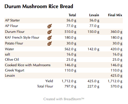 I used fresh milled and sifted durum flour for this bake.  My wife had made a big pot of rice with mushrooms that I’ve been eating all week as a side dish and I’ve been meaning to make a rice bread and also a mushroom bread, so here goes.