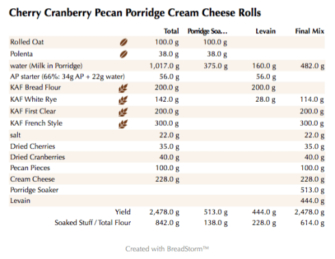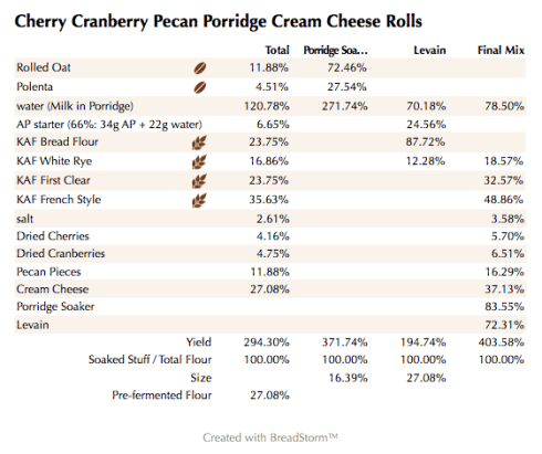 Add the dried cherries and cranberries to the water and let it hydrate for about 30 minutes. Strain the add-ins and set aside and use water for main dough. Mix the flours, and the water for about 1 minute. Let the rough dough sit for about 20 minutes to an hour. Next add the levain, cooled porridge, cream cheese and salt and mix on low for 5 minutes. Add the pecans, cherries and cranberries and mix until incorporated or you can add it by hand during the stretch and folds. Remove the dough from your bowl and place it in a lightly oiled bowl or work surface and do several stretch and folds. Let it rest covered for 10-15 minutes and then do another stretch and fold. Let it rest another 10-15 minutes and do one additional stretch and fold. After a total of 2 hours place your covered bowl in the refrigerator and let it rest for 12 to 24 hours.