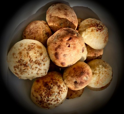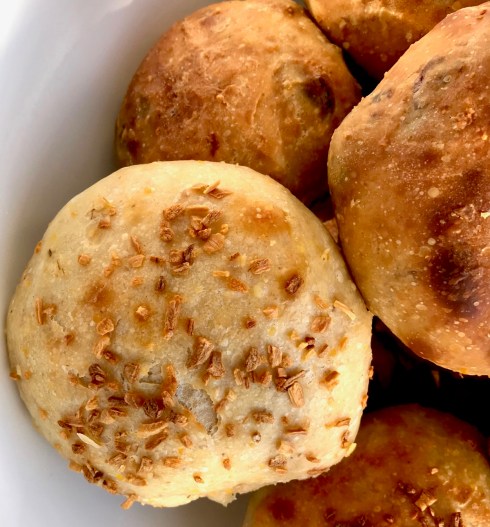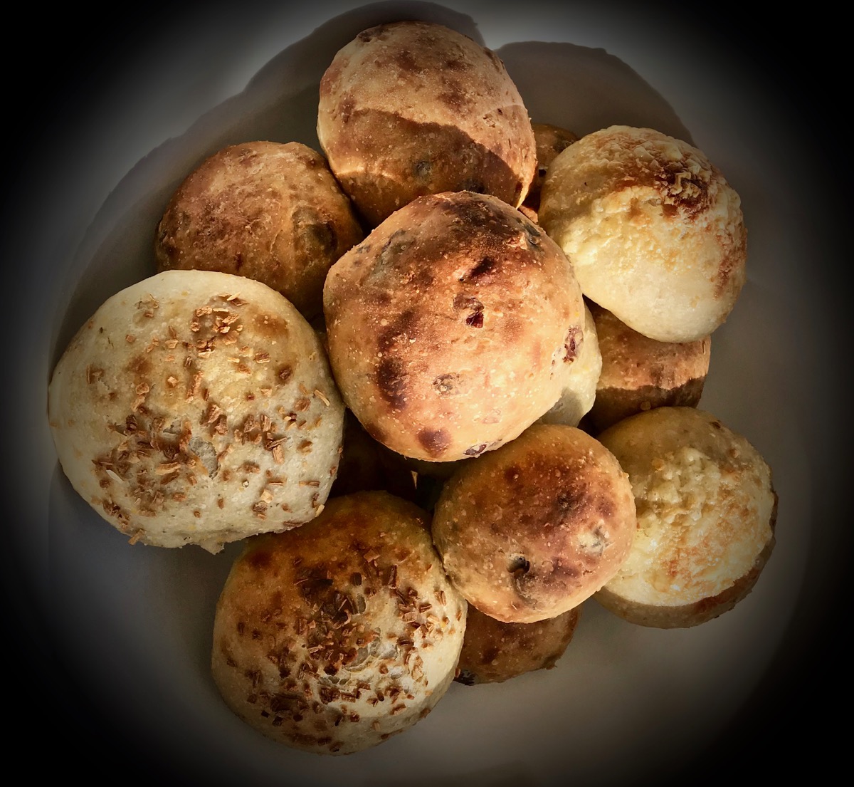 Right before you are ready to put them in the oven, apply a simple egg wash and for the batch with the cheese and onions add after applying the egg wash. Next add 1 cup of boiling water to your steam pan or follow your own steam procedure.