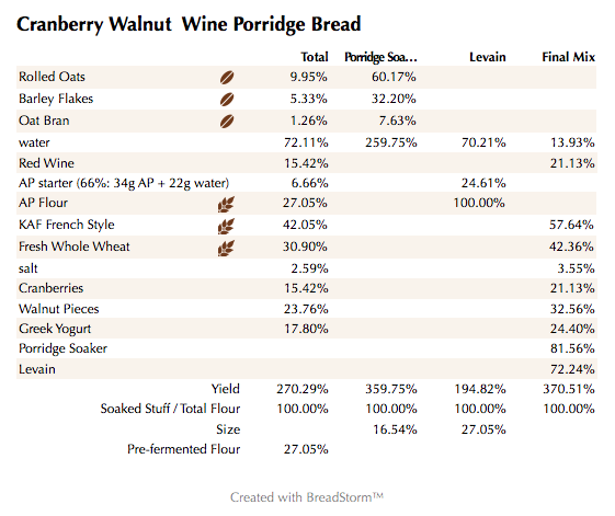 Mix the flours, wine, Greek yogurt and the water for about 1 minute. Let the rough dough sit for about 20 minutes to an hour. Next add the levain, cooled porridge, and salt and mix on low for 4 minutes. Add the walnuts and cranberries and mix for about a minute until incorporated. Remove the dough from your bowl and place it in a lightly oiled bowl or work surface and do several stretch and folds. Let it rest covered for 10-15 minutes and then do another stretch and fold. Let it rest another 10-15 minutes and do one additional stretch and fold. After a total of 2 hours place your covered bowl in the refrigerator and let it rest for 12 to 24 hours.