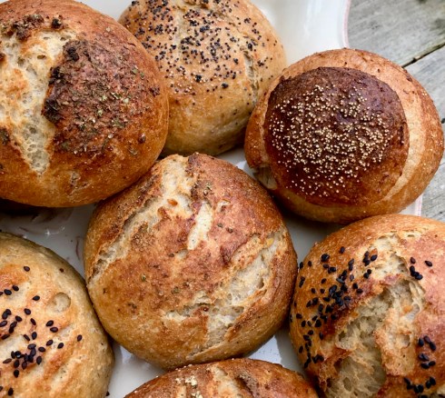 When you are ready to bake remove the bowl from the refrigerator and let it set out at room temperature still covered for 1.5 to 2 hours.  Remove the dough and shape into rolls around 125 – 135 grams each.  Place on a baking sheet with parchment paper and place a moist lint free towel on top or use plastic wrap sprayed with cooking spray.