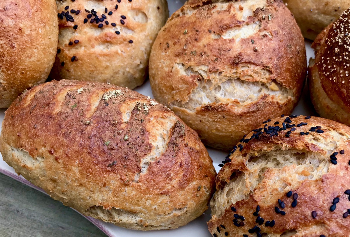 These came out great with a nice soft flavorful crumb.  I used some white and black poppy seeds to top some of the rolls and also used some powdered cheese and some garlic spice mix for some of the others.  I used some scissor cuts on some of the rolls just to make them pretty.