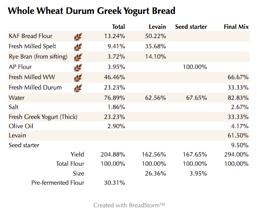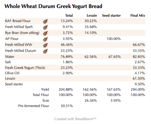 Mix the flours , yogurt and water together in your mixer or by hand until it just starts to come together, maybe about 1 minute. Let it rest in your work bowl covered for 1 hour. Next add the salt, starter (cut into about 7-8 pieces), and olive oil and mix on low for 4 minutes. Remove the dough from your bowl and place it in a lightly oiled bowl or work surface and do several stretch and folds. Let it rest covered for 10-15 minutes and then do another stretch and fold. Let it rest another 10-15 minutes and do one additional stretch and fold. After a total of 2 hours place your covered bowl in the refrigerator and let it rest for 12 to 24 hours.