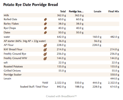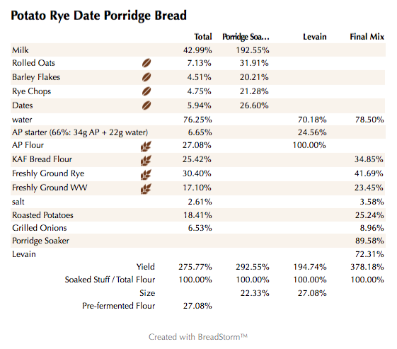 It’s been a while since I baked a porridge bread so it was time to get to it.  I wanted to add a little sweetness of dates into the porridge and of course some roasted smashed skin on potatoes didn’t hurt the crazy moist and soft crumb.  I had some left-over grilled onions so in that went as well.  The dates and onions both dissolved into the final dough but you could certainly taste their contribution in the final bake.