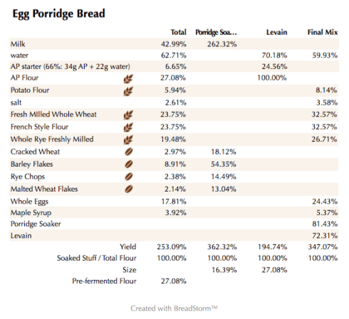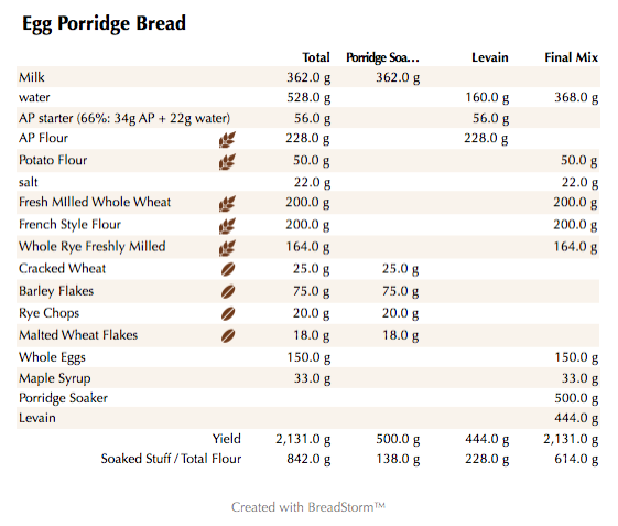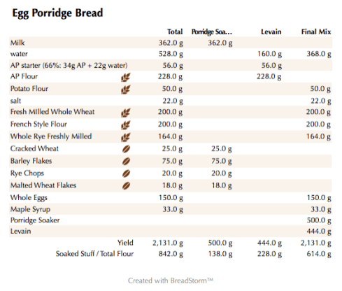 Mix the flours and the water for about 1 minute. Let the rough dough sit for about 20 minutes to an hour. Next add the levain, cooled porridge, eggs, maple syrup and salt and mix on low for 5 minutes. Remove the dough from your bowl and place it in a lightly oiled bowl or work surface and do several stretch and folds. Let it rest covered for 10-15 minutes and then do another stretch and fold. Let it rest another 10-15 minutes and do one additional stretch and fold. After a total of 2 hours place your covered bowl in the refrigerator and let it rest for 12 to 24 hours. (Since I used my proofer I only let the dough sit out for 1.5 hours before refrigerating).