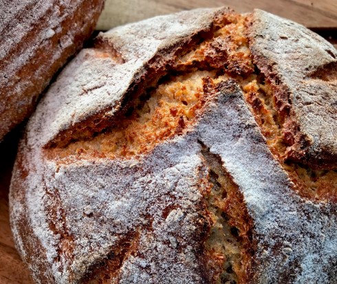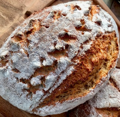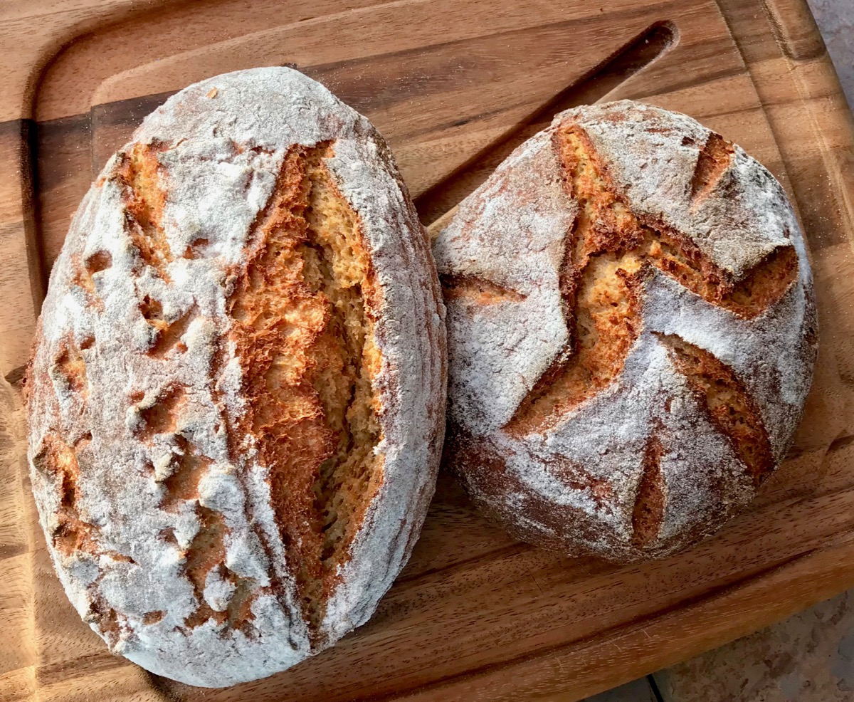 After 5 minute lower the temperature to 450 degrees. Bake for 35-50 minutes until the crust is nice and brown and the internal temperature of the bread is 205 degrees.