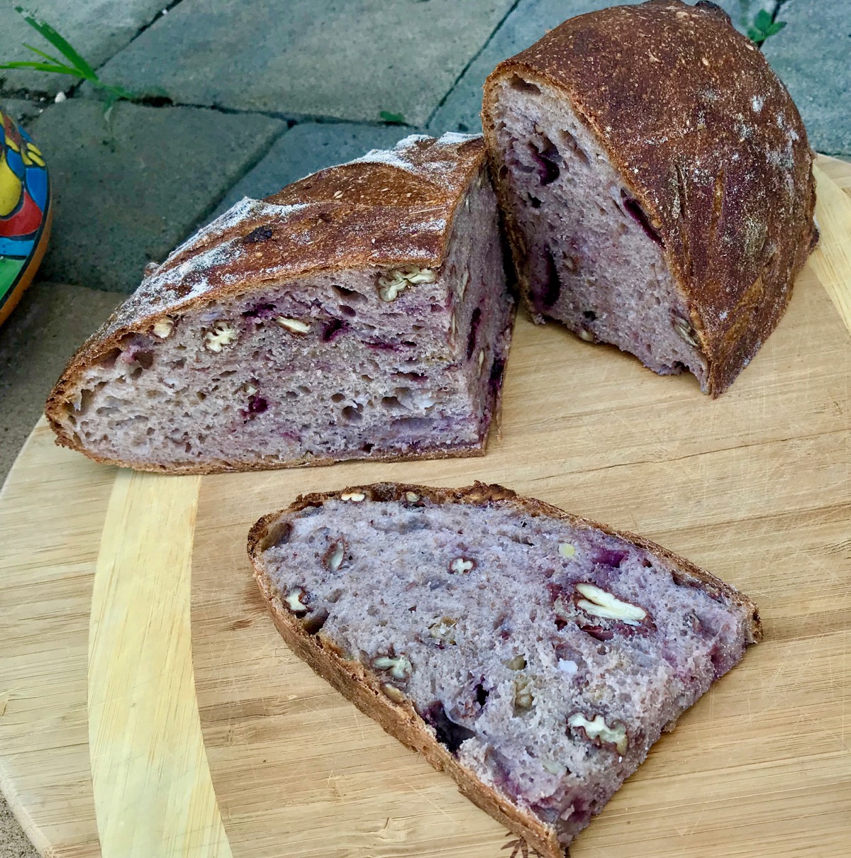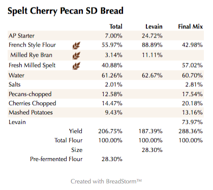 Mix the flours, and water together in your mixer or by hand until it just starts to come together, maybe about 1 minute. Let it rest in your work bowl covered for 1 hour. Next add the salt, starter (cut into about 7-8 pieces), and mashed potatoes and mix on low for 4 minutes. Next add the chopped nuts and cherries and mix until incorporated. Remove the dough from your bowl and place it in a lightly oiled bowl or work surface and do several stretch and folds. Let it rest covered for 10-15 minutes and then do another stretch and fold. Let it rest another 10-15 minutes and do one additional stretch and fold. After a total of 2 hours place your covered bowl in the refrigerator and let it rest for 12 to 24 hours.