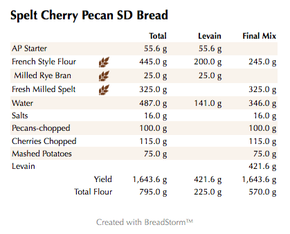 I combined the fresh spelt sifted once after milling with my Mock Mill 200 with some French style flour from KAF, left-over mashed potatoes, pecans and fresh cherries. I made one big miche this time and was very happy with the results. The crumb is nice and open and moist and the 57% spelt in this formula really shines through with a nice nutty flavor to go along with the pecans. This one is a keeper and worth trying.