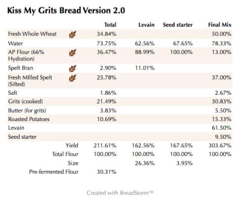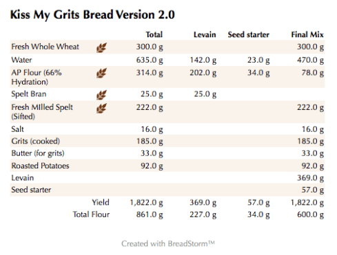 Mix the flours in your mixer or by hand along with 385 grams of the water, until it just starts to come together, maybe about 1 minute. Let it rest in your work bowl covered for 30 minutes or longer. Next add the salt, starter (cut into about 7-8 pieces), potatoes, grits and the balance of the water and mix on low for 4 minutes. Remove the dough from your bowl and place it in a lightly oiled bowl or work surface and do several stretch and folds. Let it rest covered for 10-15 minutes and then do another stretch and fold. Let it rest another 10-15 minutes and do one additional stretch and fold. After a total of 2 hours place your covered bowl in the refrigerator and let it rest for 12 to 24 hours (If you use a proofer set to 78 degrees you can finish in about 1.5 hours).