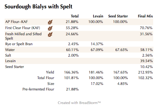 I also bulk fermented the dough instead of shaping the bialys and then refrigerating them. Other than that you can follow along with the original instructions. For the dough I bulk fermented after 3 rounds of S & F’s every 25 minutes and let the dough sit out at 78 degrees for 1.5 hours total. The next day I took the dough out and let it sit for around 1.5 hours at 78 degrees, shaped them into balls, let them proof for 1.5 hours, shaped per original recipe and baked.