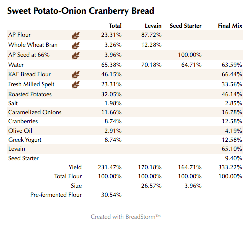 Note: Water content of the Sweet Potatoes is approximately 59 grams which is not reflected in the overall hydration but was taken into account when formulating the amount of water to use.