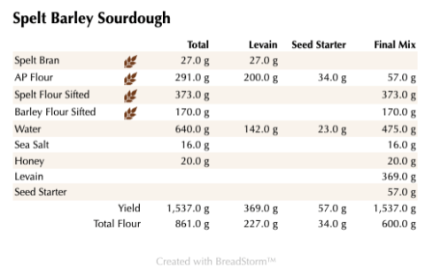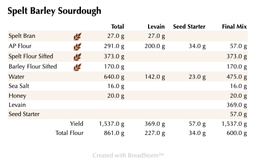 Mix all the levain ingredients together for about 1 minute and cover with plastic wrap. Let it sit at room temperature for around 7-8 hours or until the starter has doubled. I used my proofer set at 83 degrees and it took about 4 hours. You can use it immediately in the final dough or let it sit in your refrigerator overnight.