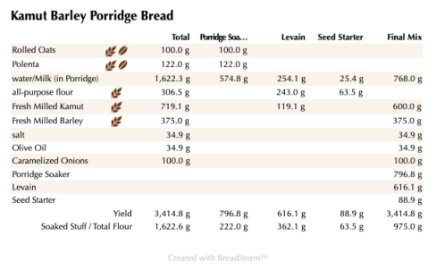 I had not made a porridge bread in a little while, and I’ve been loving adding freshly ground barley to my bakes, so here we are. I thought freshly ground Kamut would make a nice combination with the barley and I was not mistaken.