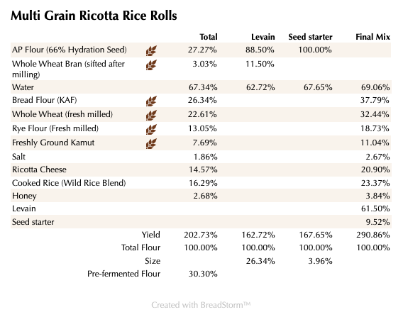Note: the water content from the ricotta cheese is about 72% and is not indicated in the hydration. This was a pretty sticky dough as the water from the ricotta and also the moist rice really made a big difference. You want to make sure to hold some water back from the first mix and add it after the first autolyse to make sure you don’t end up over-hydrating the dough.