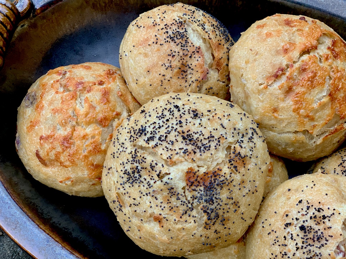 When you are ready to bake remove the bowl from the refrigerator and let it set out at room temperature still covered for 30 minutes. Remove the dough and shape as desired. This is a pretty wet and sticky dough. I don’t like to add a lot of extra flour when making rolls so I used wet hands and a dough scraper to help me shape the rolls. Each roll was around 150 grams total weight.