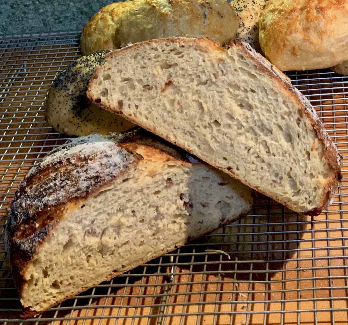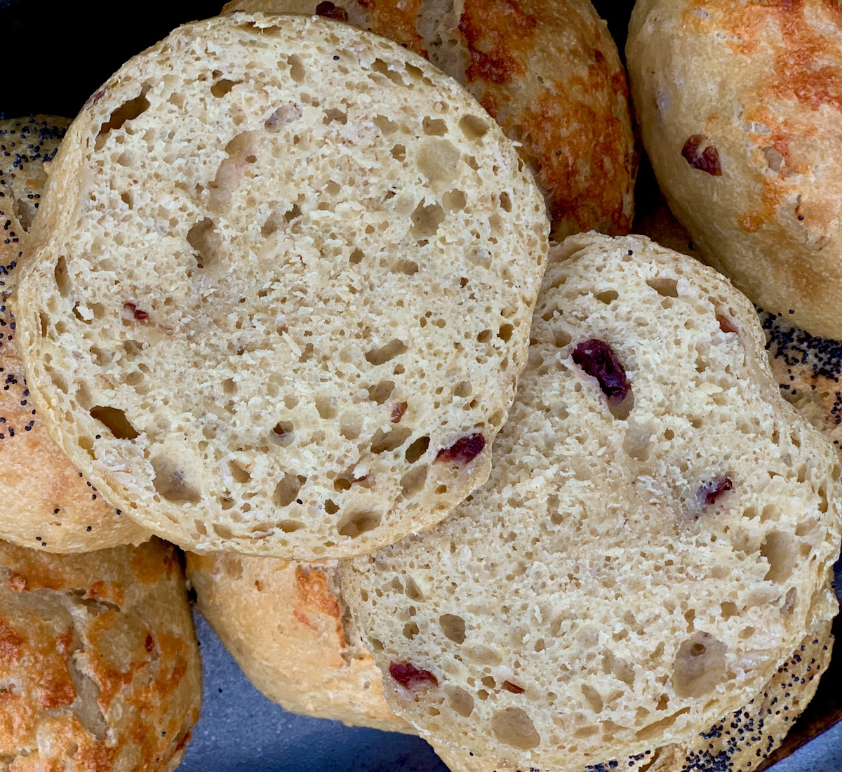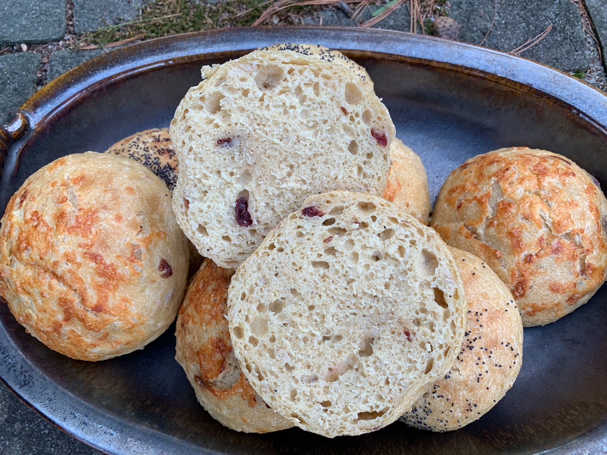 This is the same basic formula as my last post except this time I added some cranberries and reduced the egg amount slightly. I love the flavor of these rolls and they are worth giving them a try as I know you will not be disappointed. Keep in mind this is a pretty wet dough and is not the easiest to form into rolls. I used wet hands and a dough scraper to help me. I don’t like adding a lot of extra flour when shaping rolls, but you can certainly do that if you desire, just don’t end up making them too dry.