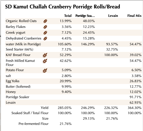Add about 3/4’s of the milk called for in the porridge to the dry ingredients including the cranberries in a small pot set to low and stir constantly until all the milk is absorbed. Add the remainder of the milk, plus the Greek yogurt and keep stirring until you have a nice creamy and soft porridge. Remove from the heat and let it come to room temperature before adding to the dough. I put mine in the refrigerator and let it cool quicker.
