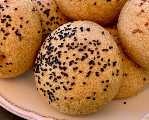 The dough will take 1.5 to 2 hours depending on your room temperature and will only rise about 1/3 it’s size at most.  Let the dough dictate when it is read to bake not the clock.  Before baking, brush with an egg wash or melted butter and add any toppings desired.  I use black sesame seeds and toasted onions.