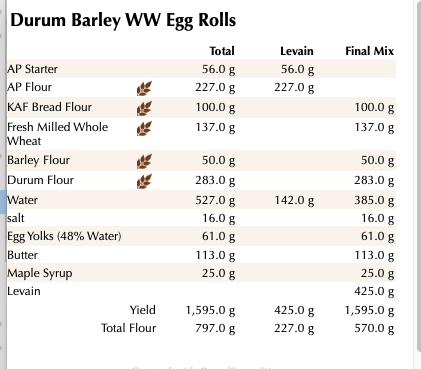 Mix the flours  and the water for about 1 minute.  Let the rough dough sit for about 20 minutes to an hour.  Next add the levain,  and the rest of the ingredients and mix on low for 4 minutes.  You should end up with a cohesive dough that is slightly tacky but very manageable.  (Note:  if you are not using fresh milled flours you may want to cut back on the water)  Remove the dough from your bowl and place it in a lightly oiled bowl or work surface and do several stretch and folds.  Let it rest covered for 10-15 minutes and then do another stretch and fold.  Let it rest another 10-15 minutes and do one additional stretch and fold.  After a total of 2 hours place your covered bowl in the refrigerator and let it rest for 12 to 24 hours.  (Since I used my proofer I only let the dough sit out for 1.5 hours before refrigerating).