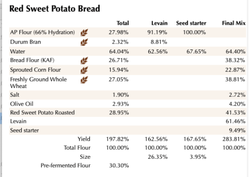 I love adding sweet potatoes to bread.  I have to admit I thought I had roasted some purple sweet potatoes which I love to use to add that beautiful purple color to the bread.  As it turns out I had roasted some red purple potatoes which are actually much tastier to eat by themselves.  They don’t add a lot of color but are do add a nice amount of moisture and spring to the crumb.