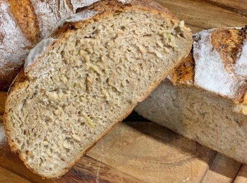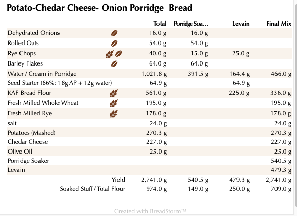 It has been a while since I baked a porridge bread. I am a big fan of the moist and flavorful crumb I get. I added some onions directly into the porridge which helps impart a mild onion flavor. I used some freshly milled whole wheat and rye along with KAF bread flour.