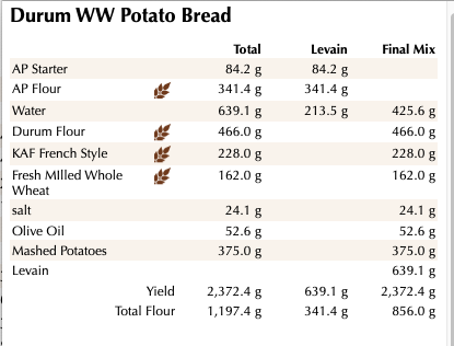 My friend requested a couple of loaves for the holiday weekend so I decided to do a variation of one of my favorites with fresh milled Durum flour and Whole Wheat along with some KAF French style flour. The addition of the mashed potatoes really makes this crumb nice and moist and soft.