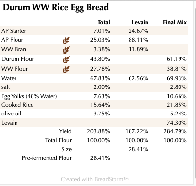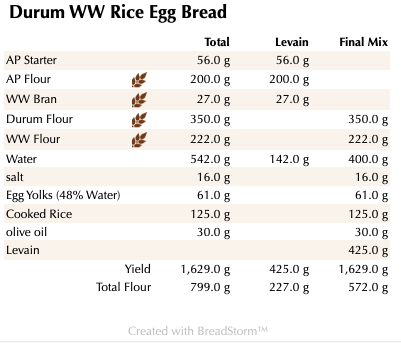 Mix the flours, egg yolks and the water for about 1 minute. Let the rough dough sit for about 20 minutes to an hour. Next add the levain, cooked rice, olive oil and salt and mix on low for 4 minutes. (Note: with the Ankarsrum I adjusted the speed from low to medium). You should end up with a cohesive dough that is slightly tacky but very manageable. (Note: if you are not using fresh milled flours you may want to cut back on the water). Remove the dough from your bowl and place it in a lightly oiled bowl or work surface and do several stretch and folds. Let it rest covered for 10-15 minutes and then do another stretch and fold. Let it rest another 10-15 minutes and do one additional stretch and fold. After a total of 2 hours place your covered bowl in the refrigerator and let it rest for 12 to 24 hours. (Since I used my proofer set to 79 degrees F. I only let the dough sit out for 1.5 hours before refrigerating).