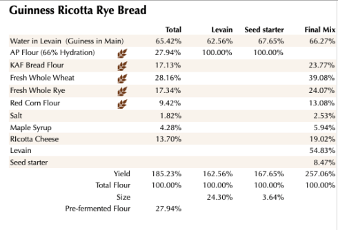 I love the rich flavor Guinness adds to bread. The combo of fresh milled Barton Mills Danko Rye and Ruby Whole Wheat was a winner. The maple syrup helped add just the right amount of sweetness and the ricotta cheese helped create a moist open crumb.