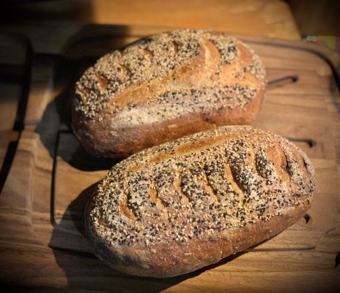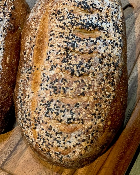 Next I decided to add some additional % of whole grains and see if I could achieve a similar crumb and flavor but bake them a regular loaf using my brotforms. I used freshly ground whole wheat sifted 2x as well as freshly ground Spelt also sifted 2x. I added black and white sesame seeds which really tasted great.