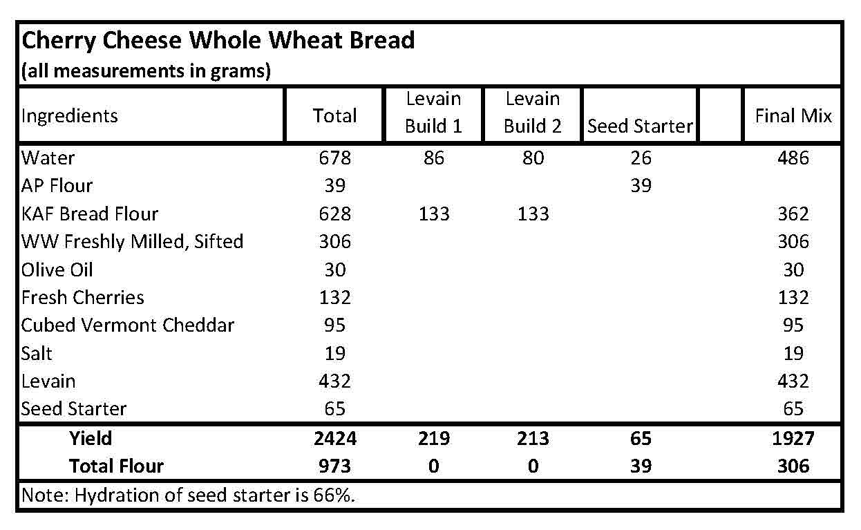 I was so happy with how my last bake came out using a two step levain build I decided to try it again. I wanted to use some of the Vermont cheese we bought on our vacation last month and I had a bunch of tasty cherries we bought from the store just begging to be put to good use.
