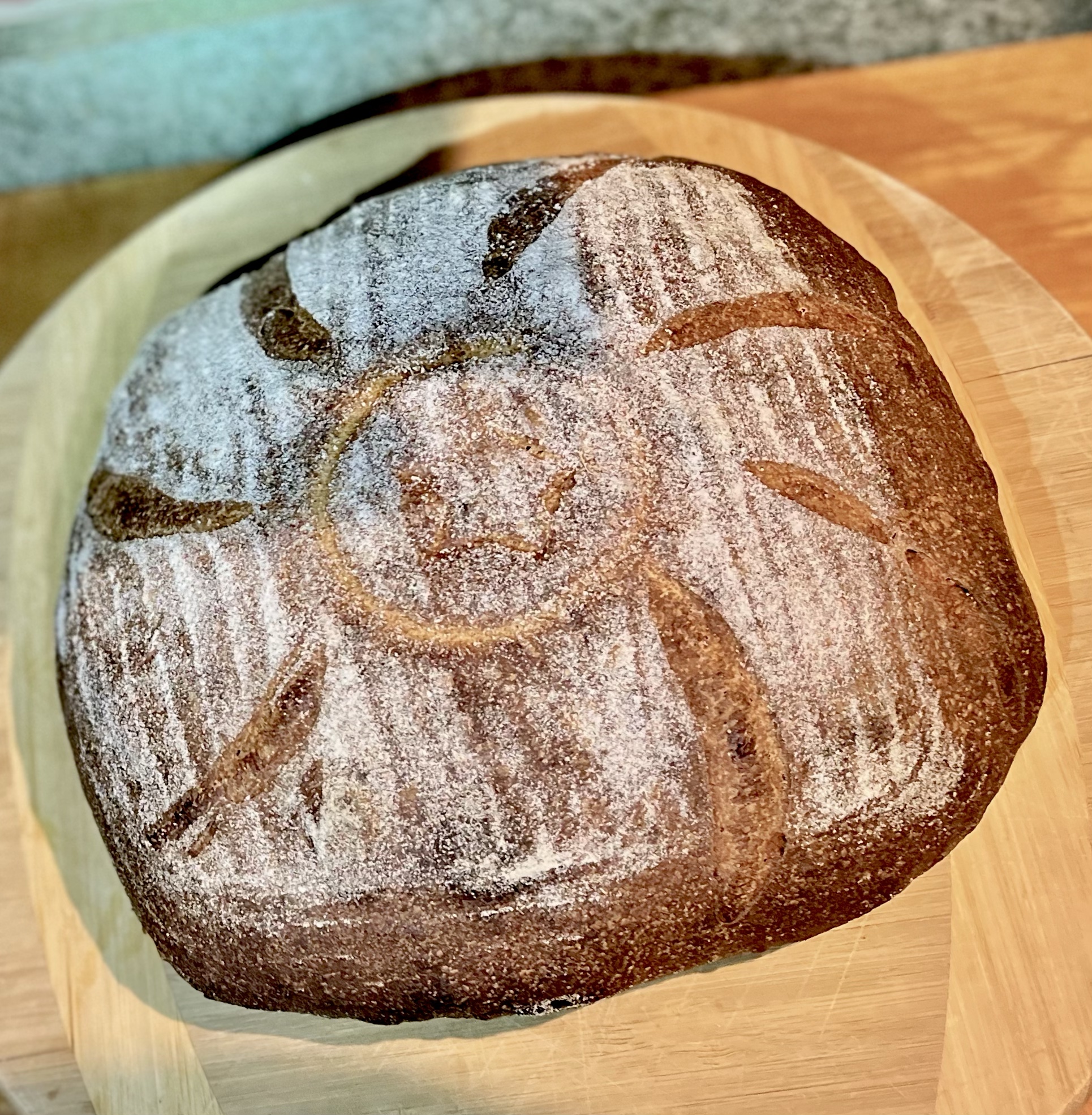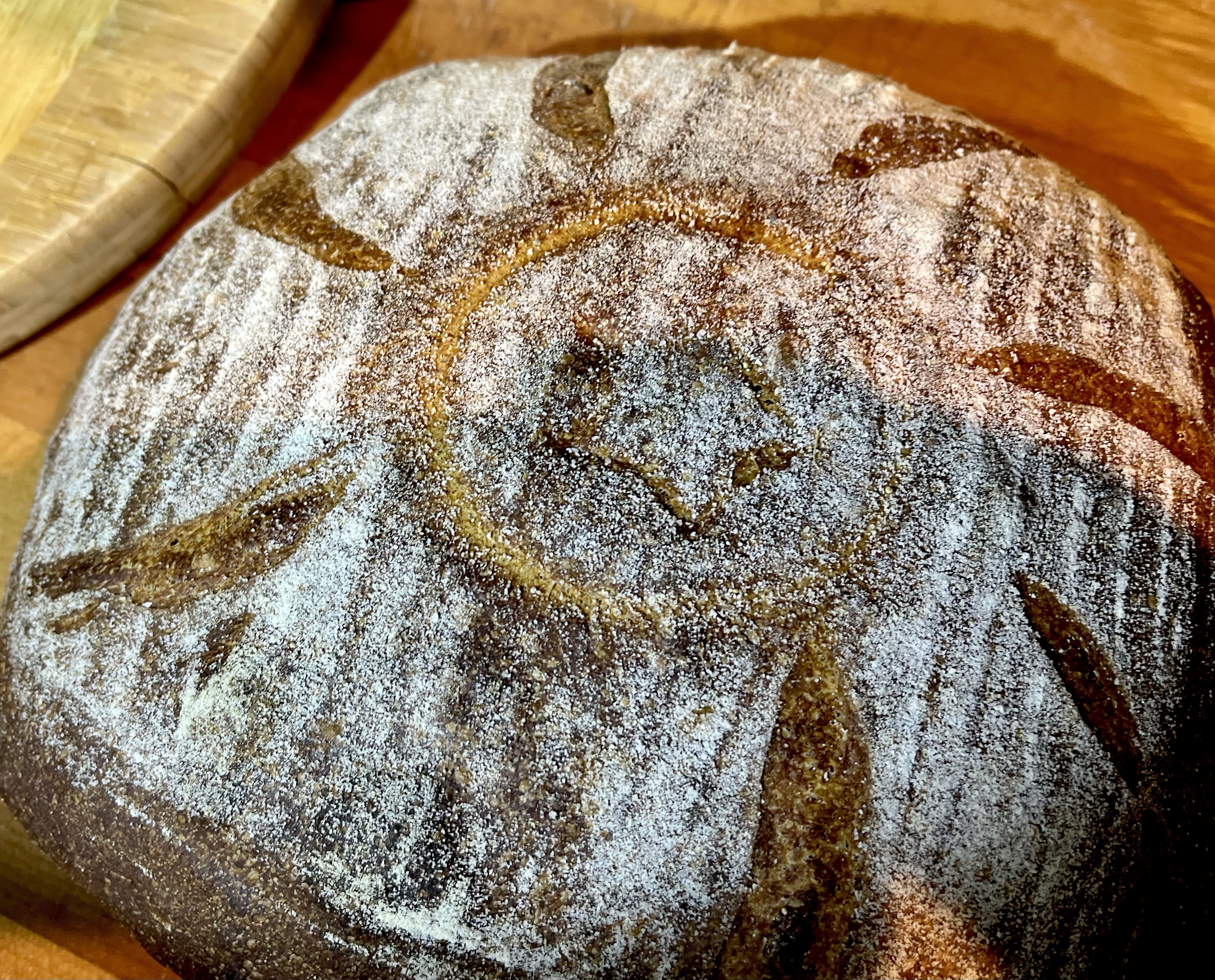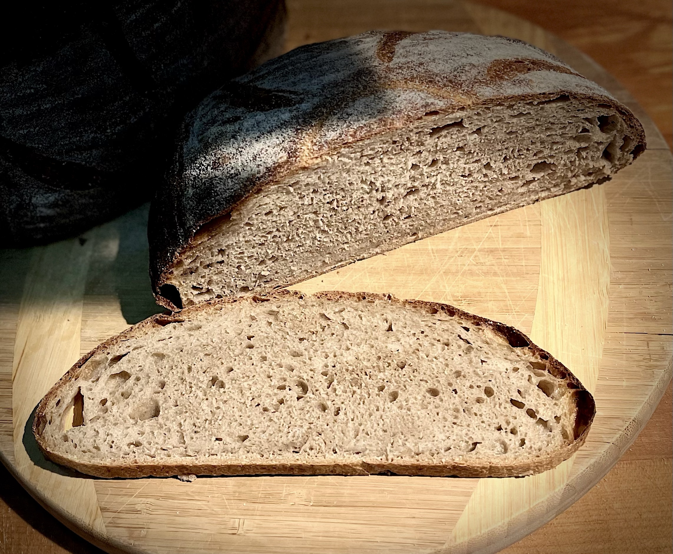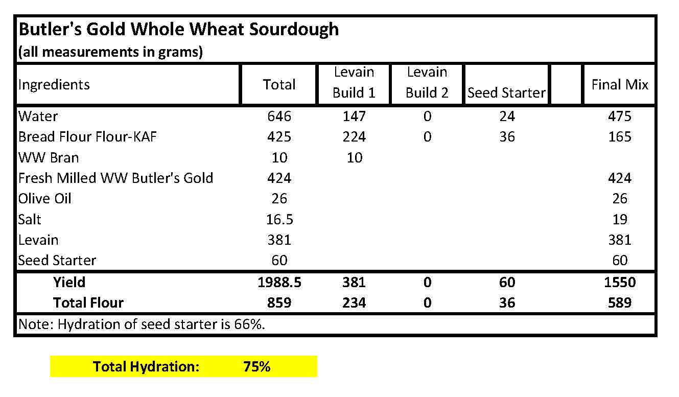 I wanted to try another new grain I purchased from Barton Springs Mill called Butler’s Gold Whole Wheat. The whole wheat berries are harvested from a small farm in Texas. It’s supposed to be a good neutral flavored whole wheat perfect for mixing with other stronger flours. I decided to use this exclusively and only mixed it with a small amount of BF. I did use KAF BF in the Levain so overall it ended up being a 50% WW bread. I milled the Butler’s Gold berries to a high extraction sifting and milling twice.