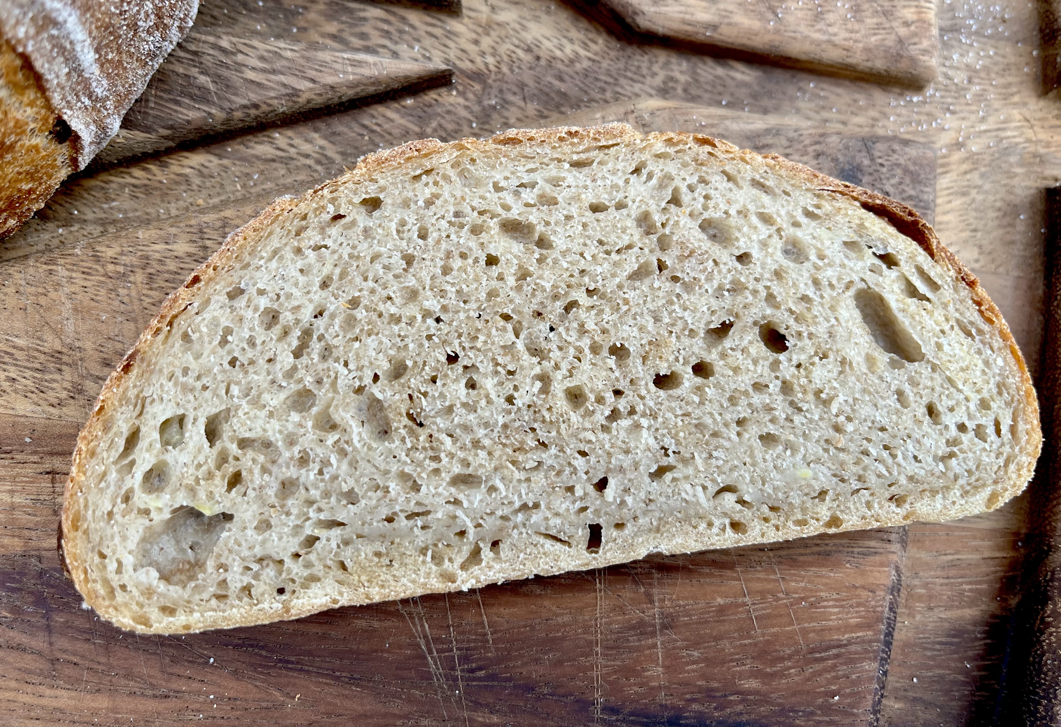 I was very happy with how this one turned out. The crumb was moderately open and you can really taste the nutty flavor of the durum and clean flavor from the whole wheat. The potatoes add a nice softness to the crumb.