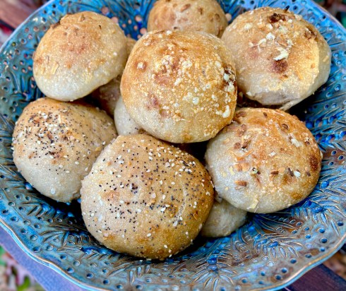 For toppings I used a beaten egg with a little water and salt to brush the rolls and sprinkled on some “everything bagel” topping on some, dried onions and grated some Vermont cheddar on some others.