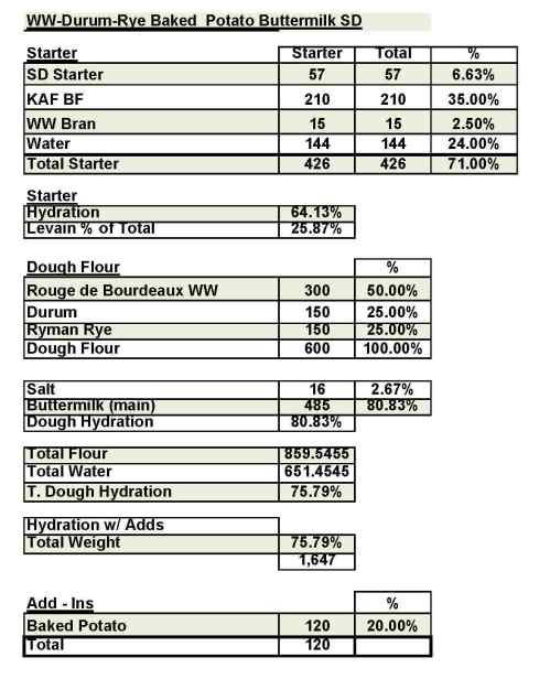 This was a nice flavorful bread made with fresh milled Durum, Rye and Rouge de Bordeaux whole wheat. I used some baked potatoes that were mashed up but still chunky so you end up with a rustic bread with pieces of potato throughout.