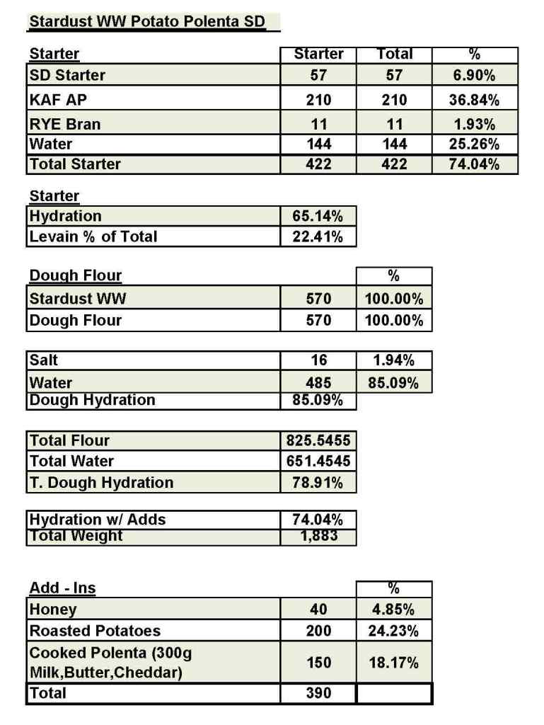 I also wanted to try making Polenta using fresh milled Oaxacan Green corn which is a Heirloom variety. There is nothing like fresh milled corn with its earthy and nutty flavor. My polenta ended up more like a corn flour scald since I didn’t adjust my mill course enough. It still smelled and tasted great after adding some butter and grated Vermont Extra Sharp cheddar. I used milk to make the polenta instead of water to give it some extra creaminess. I added 300 grams of milk to 150 grams of ground corn along with the butter and cheese. I ended up extra polenta as it didn’t absorb all of the liquid. This also along with the potatoes added a lot of extra hydration to the dough which made this one a lot higher than the 79% on the formula. If I were to repeat this I would probably cut back on the water 40-50 grams or more.