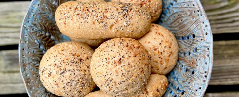When you are ready to bake, preheat your oven to 445 F and prepare for steam. I have a heavy-duty baking pan on the bottom rack of my oven with 1 baking stone above the pan and one on the top shelf. I pour 1 cup of boiling water in the pan right after I place the dough in the oven. Remove your dough from the refrigerator and using a scrambled egg yolk, coat the rolls and top with seeds, toasted onions, cheese, or whatever you desire.