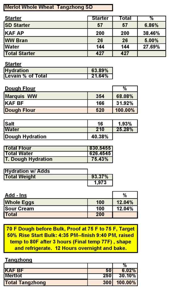 I usually use water to make the Tangzhong which is typically 5 parts water to one part flour. I decided to try something new and used a nice Merlot wine in place of the water. It worked out great and gave the final dough a subtle wine flavor but not overpowering.