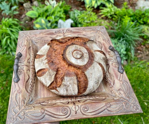 When you are ready to bake, an hour beforehand, preheat your oven to 540°F and prepare for steam. Let your dough sit at room temperature while the oven is warming up. When ready to bake, score as desired. Prepare your oven for steam. I have a heavy-duty baking pan on the bottom rack of my oven with 1 baking stone above the pan and one on the top shelf. I pour 1 cup of boiling water into the pan right after I place the dough in the oven. I then lower the temperature of the oven to 450°F for a miche or 455°F for smaller individual loaves. Bake until they are nice and brown and the internal temperature is at least 205 – 210°F.