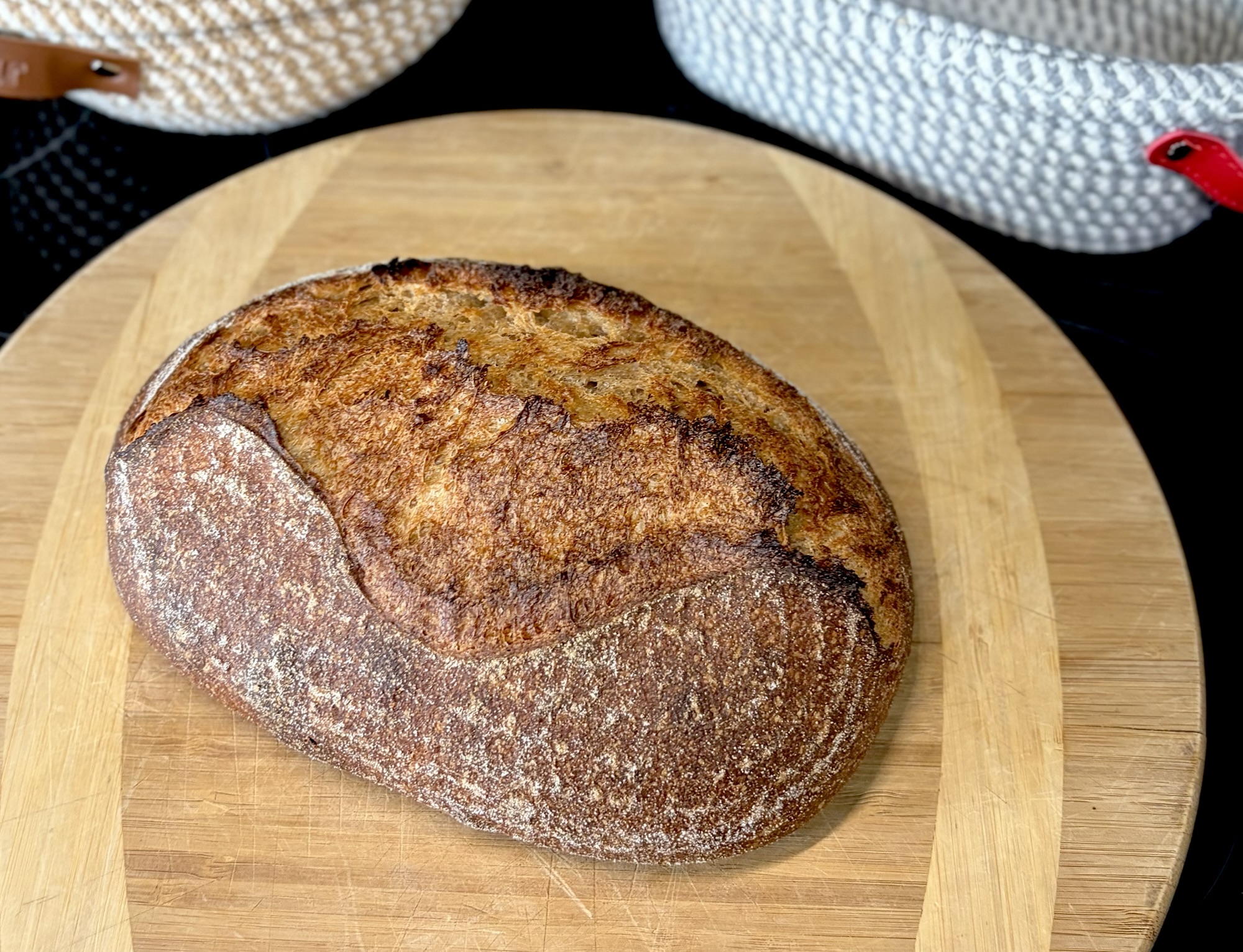 I used my Ankarsrum to mix the dough and oven-baked it on a baking stone with steam.